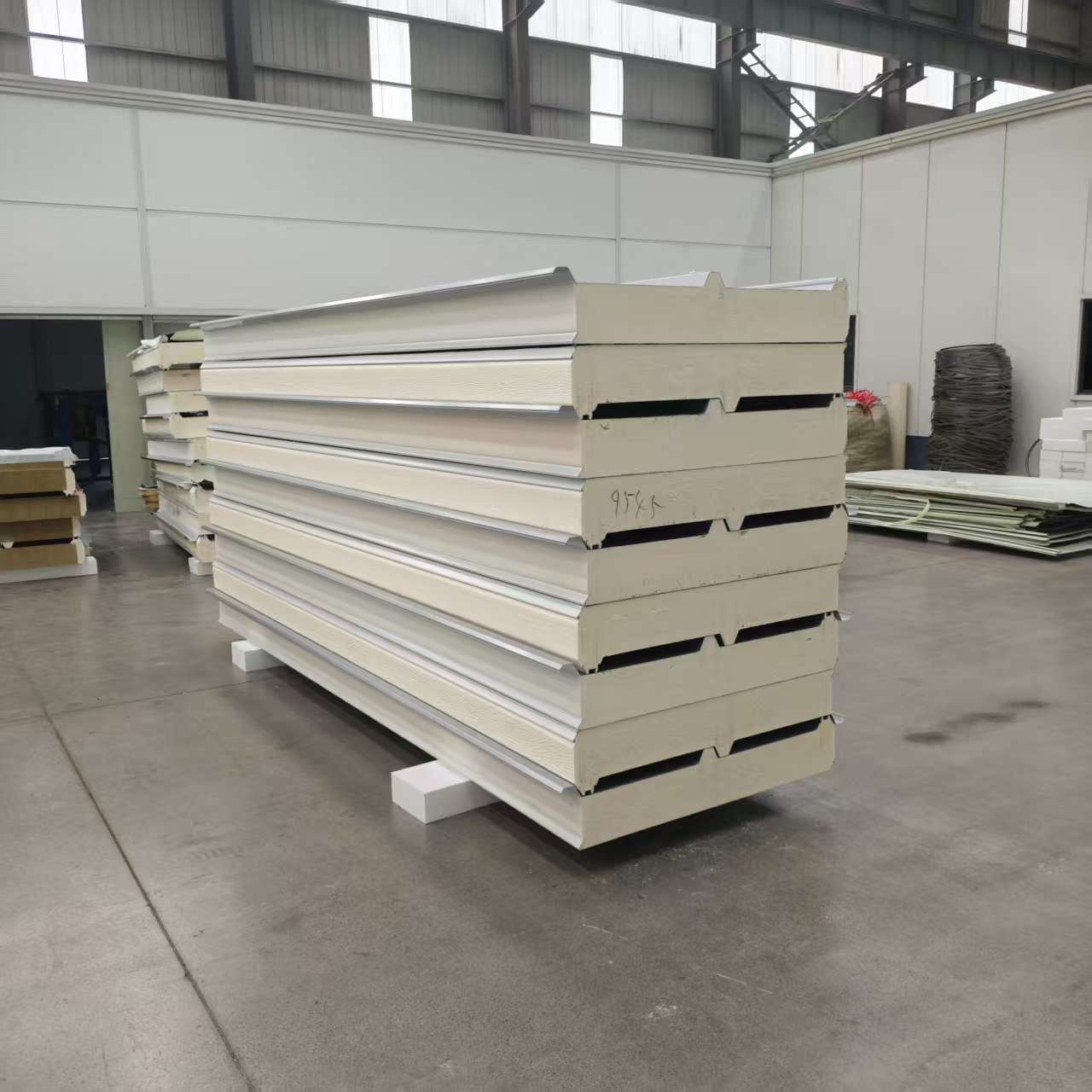 High strength Make full use of the rigidity of the metal molding plate, have better anti-tramplingperformance, and set up additional layers (structures) such as lightning protection and walkways on the roof. Excellent waterproofing The first-level waterproof structure provides three fixing methods: point fixing, no perforationfixing and bonding method, forming a first-level waterproof roof system with both rigid andflexible and excellent thermal insulation. Keep heat well The wave crest of the molded plate is filled with polyurethane rigid foam, which improves thethermal insulation and mechanical properties Install quickly Highly integrated construction, installation speed is fast.